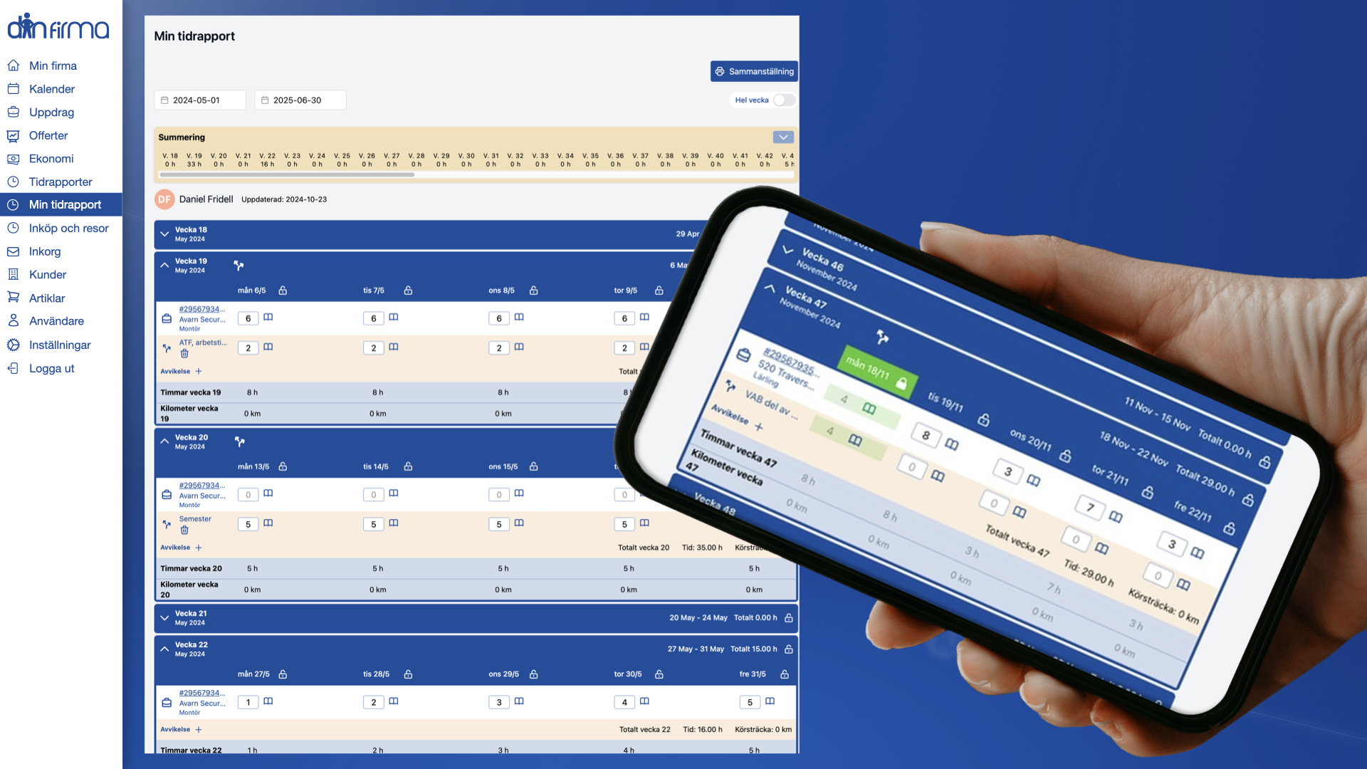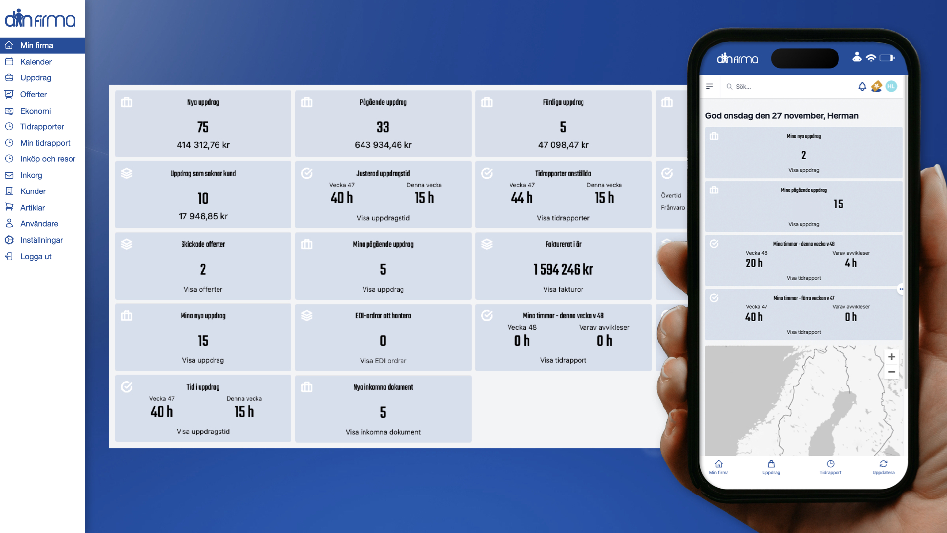 Din firma är ett heltäckande system – offerter, arbetsorder, lön, tidrapportering och mycket mera – det innebär att du kan ägna dig åt ditt jobb och sedan gå hem.