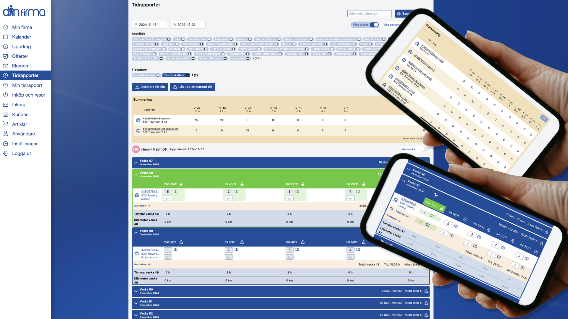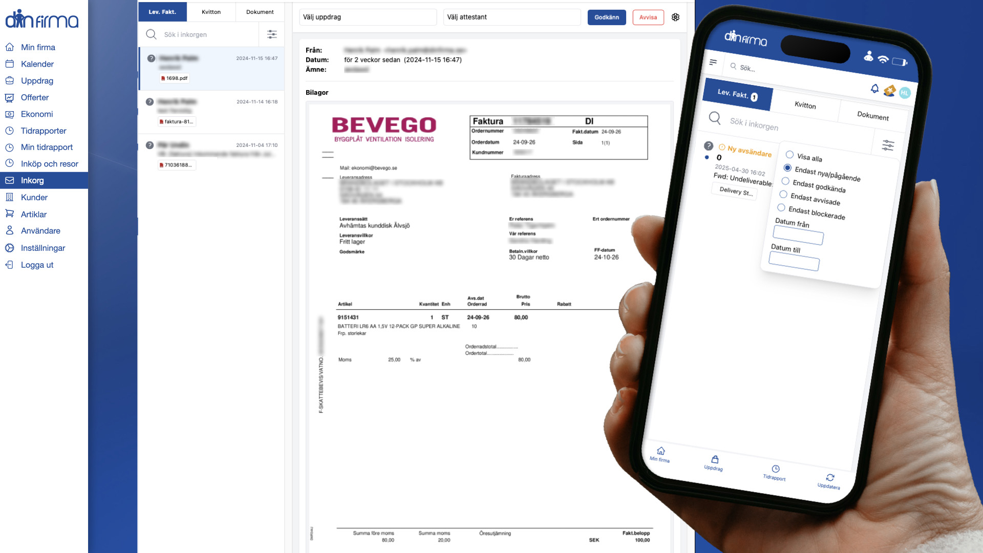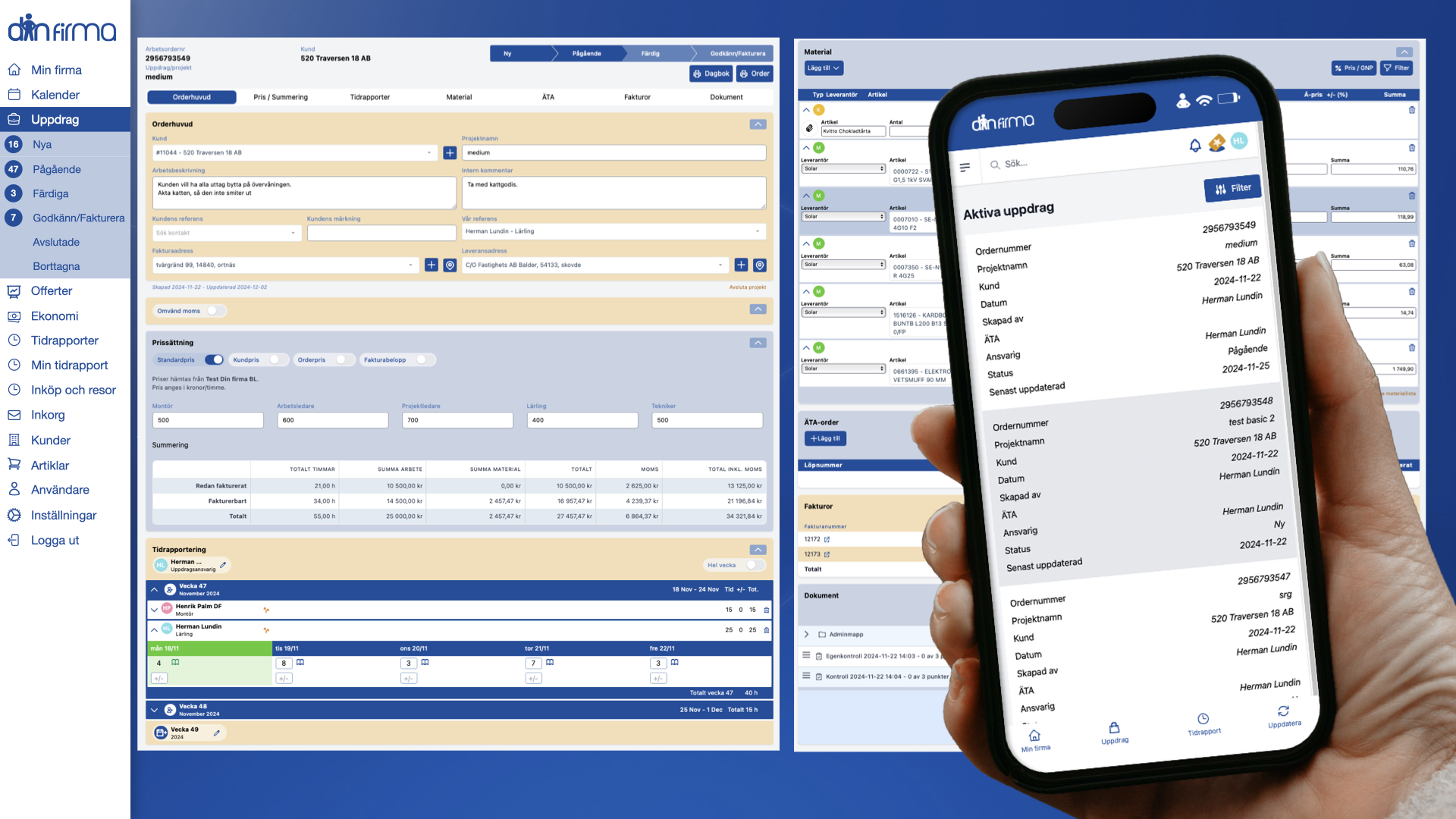 Här hanterar du smidigt allt från offerter, arbetsorder och ÄTA-arbeten till fakturering, tidrapportering, löner och materialinköp. Du kan även godkänna och betala leverantörsfakturor, attestera kvitton och hantera utlägg, milersättning och traktamenten – allt samlat på ett ställe.