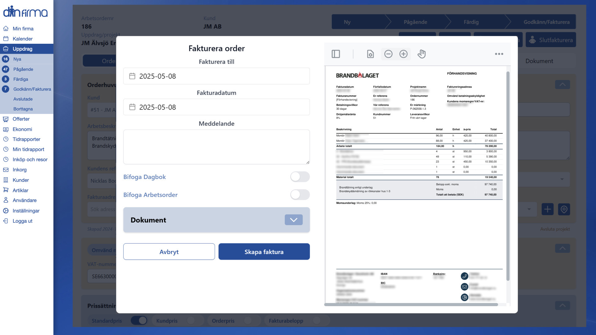 Direkt från uppdragsvyn skapar du din faktura, väljer eventuella bilagor att skicka med samt leveransmetod, e-faktura, pdf eller utskrift.