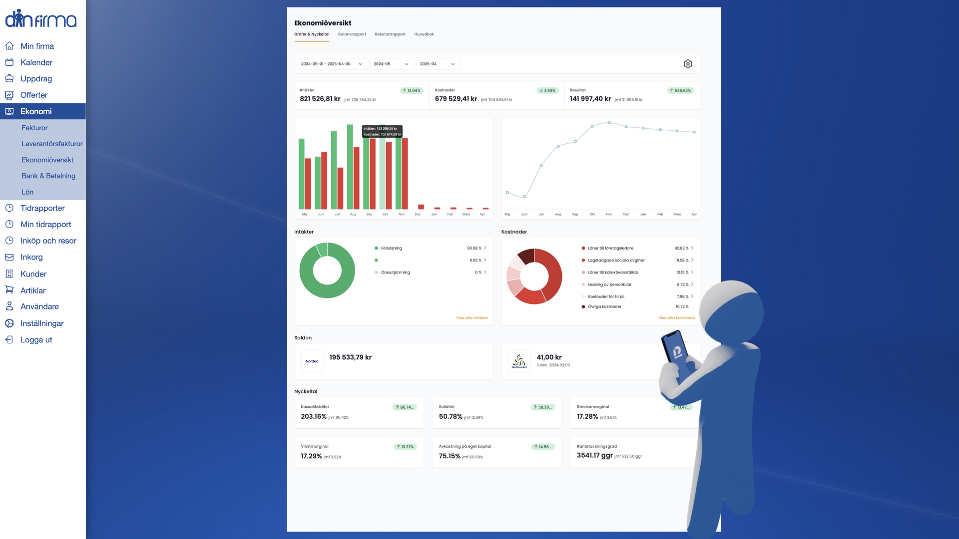 Tydlig överblick över kund- och leverantörsfakturor med aktuell status. Ekonomiöversikt innehållande grafer och nyckeltal, se och ladda ner balans- och resultatrapporter. Godkänn betalningar, se lönebesked.