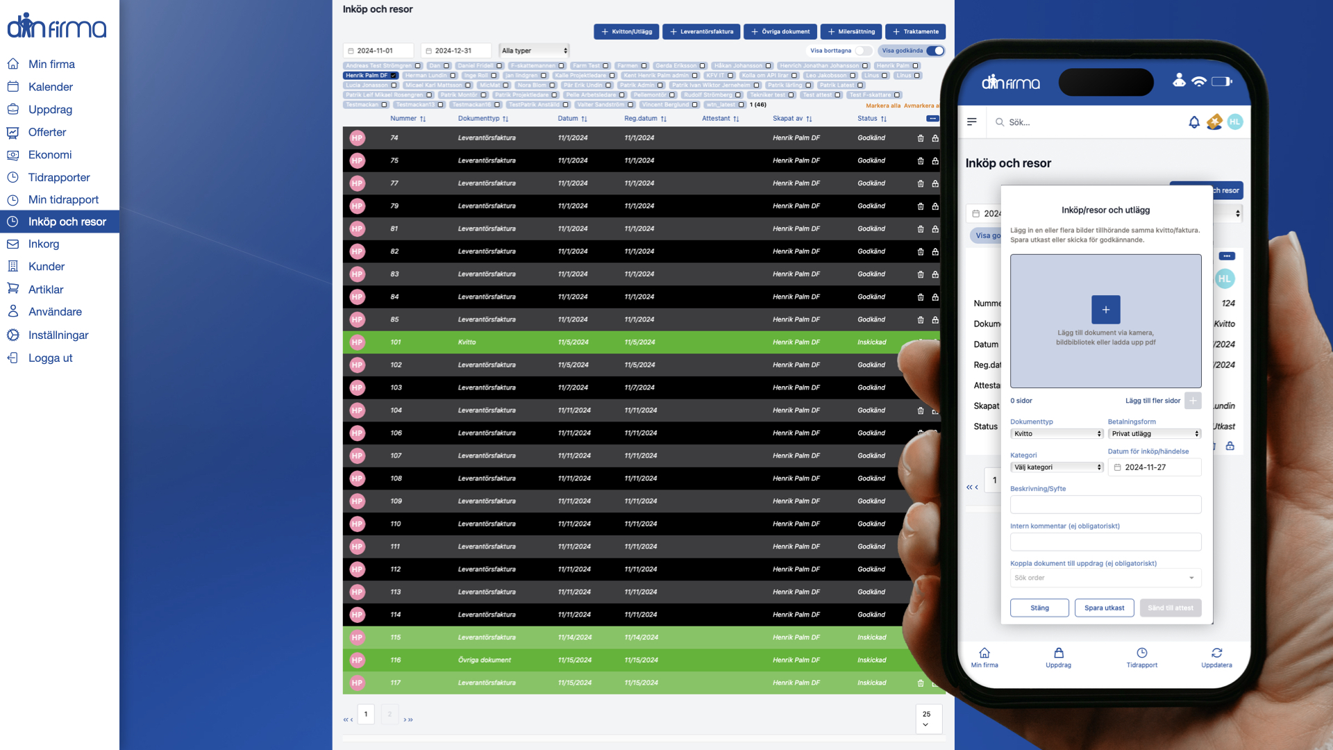 Fota kvitton eller ladda upp PDF:er. Lägg till milersättning och traktamente, och koppla utlägg till rätt projekt.